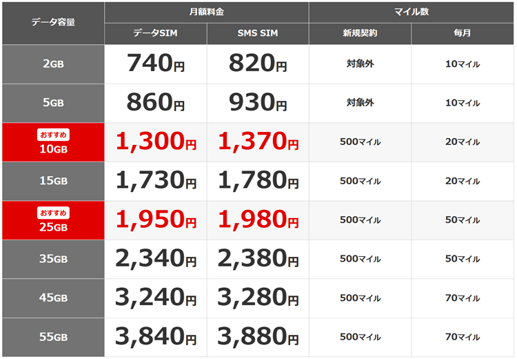 例えば、一番データ量が多い45GBの音声SIMであれば毎月130マイル!!年間で1,560マイルですね。