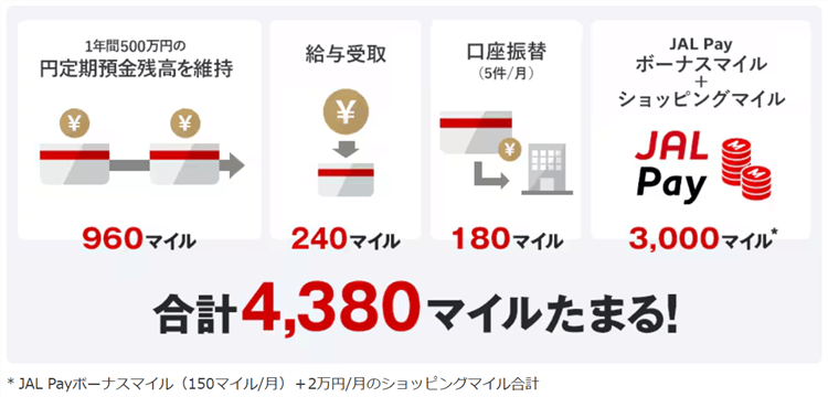 - JAL NEOBANKプレミアム 普通預金マイル:20マイル×6か月=120マイル