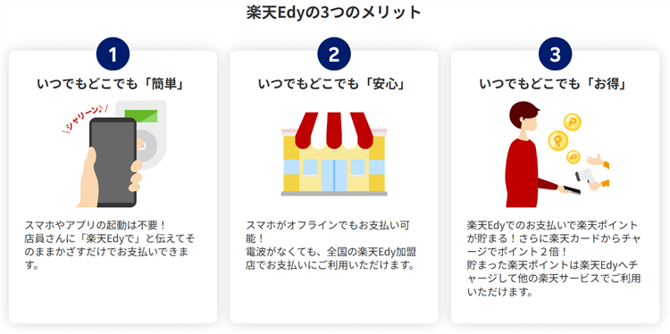 全国の楽天Edy加盟店での支払いに利用が可能で、楽天カードからのチャージでポイントが2倍貯まるようになっています。
