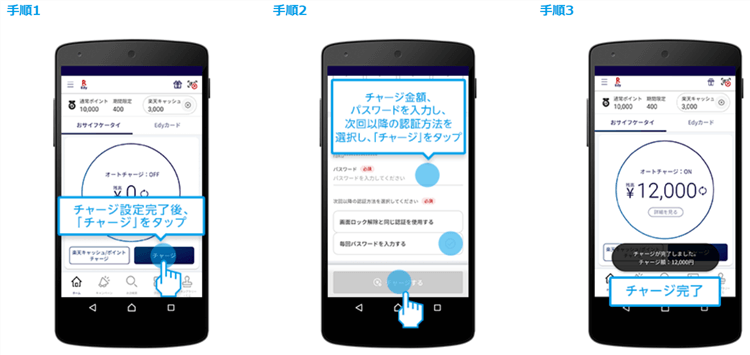 楽天Edyへのチャージですが、android端末より「楽天Edy」アプリを開いてください。