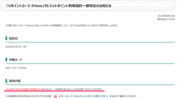 「Vポイントカード Prime」2025年12月1日以降のご利用分からJALPayチャージ利用代金のポイント付与を終了