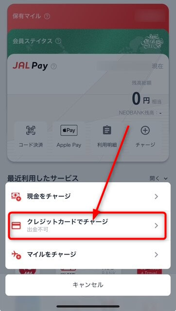 JAL Payの白いカードを選択肢、チャージをタップすると上記の画面となります。クレジットカードでチャージをタップしましょう。