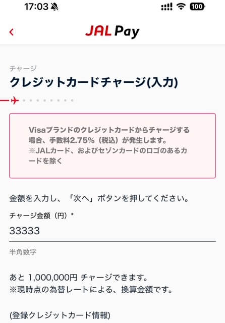 クレジットカードの情報を登録したらあとはJALペイへチャージしていくようにしましょう!