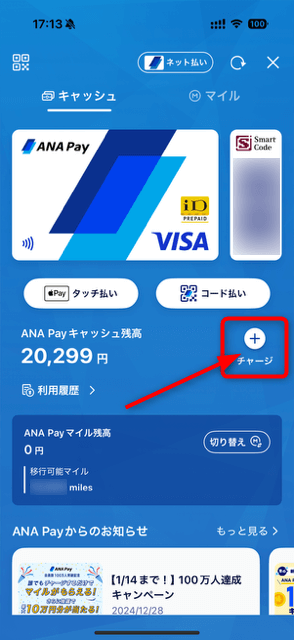 JAL Payと違うのは、ANAカードのチャージでもマイルが貯まるようになります。