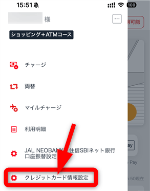 - 画面左上メニュー内、「クレジットカード情報設定」をタップ