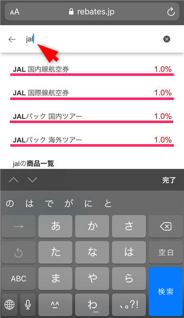 そして検索バーが上段にあるので、こちらに「JAL」と打ち込んでみてください。