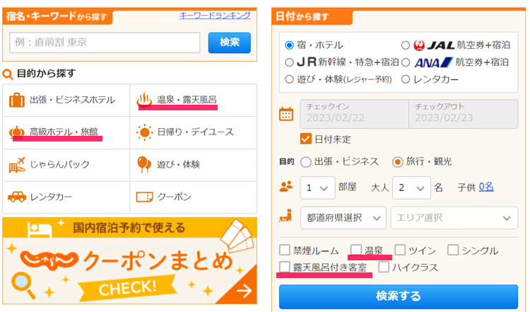 キーワードや、こだわり検索の欄を見ると分かりますが、温泉、露天風呂付き客室などの項目がありますよね!