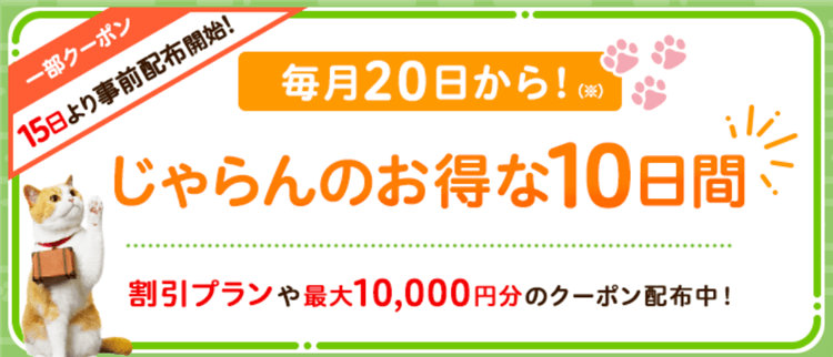 こちらは毎月20日から配布するお得なクーポンで最大10,000円分もお得になるクーポンです。