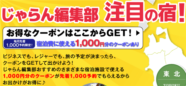 それと毎月1,000予約限定ですが、宿泊費に利用が出来る1,000円分のクーポンもあります。