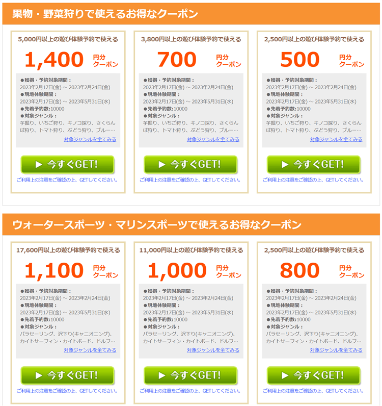 また宿以外でも利用ができる遊びや体験予約でもクーポンがあったりますよ!