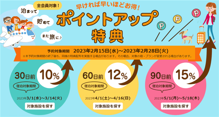 宿泊完了(対象外:じゃらんパック、遊び・体験予約、日帰り・デイユース予約など)【ポイント却下条件】