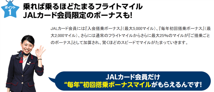 こちらJALカード会員であれば、毎年初回搭乗の際にボーナスマイルが貰えちゃいます!!