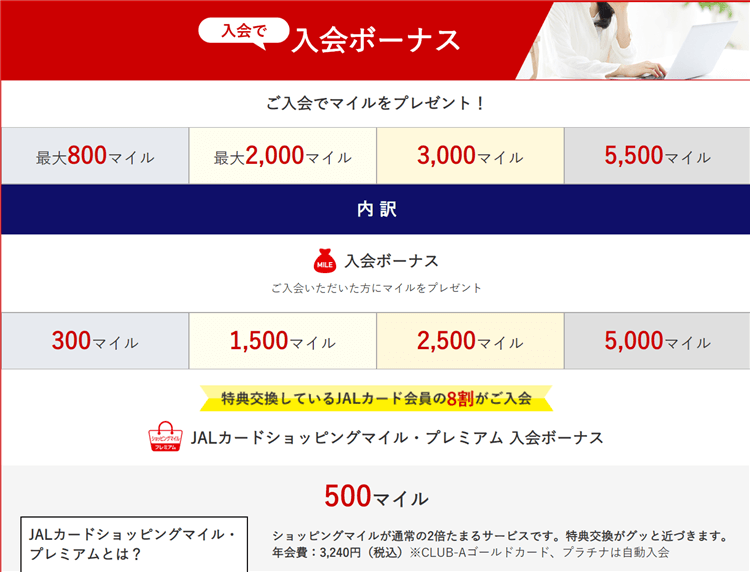 JALカード側の独自キャンペーンもやっており、発行するカードによって異なりますがお得にマイルが貯まるようになっています!!