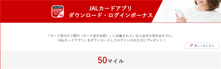 JALカードアプリのダウンロードで貰えるマイルとなります。50マイル。