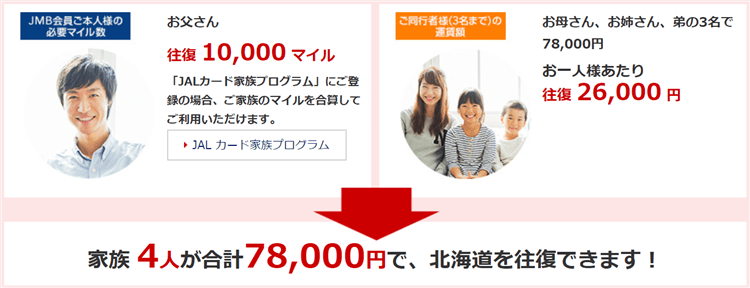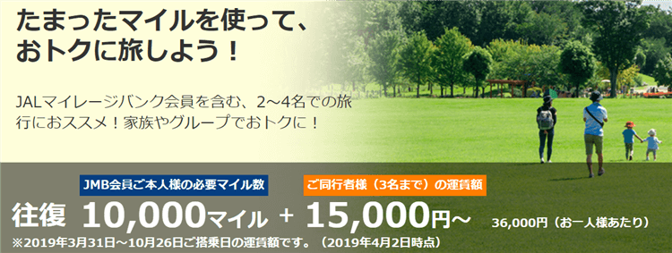 JALの会員の方であれば国内の特典航空券が往復で10,000マイル、家族は友人などでのグループ(3名まで)の運賃が一人当たり15,000円~36,000円で行けるようになります。