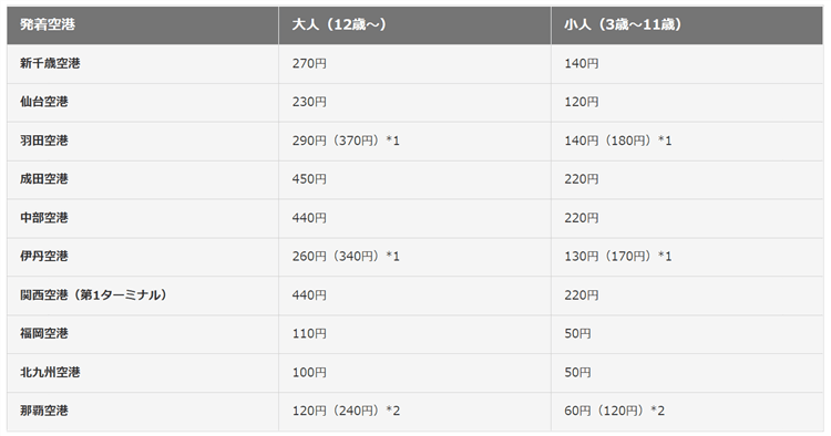 新千歳空港、仙台空港、羽田空港、成田空港、中部空港、伊丹空港、関西空港、福岡空港、北九州空港、那覇空港
