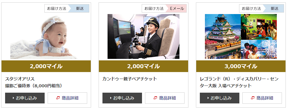 2000マイルの交換でも、スタジオアリスの8000円相当の優待券などと交換できるので、意外と使えそうな特典ですよ。