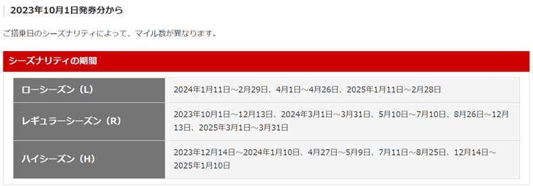 | 路線 | 基本マイル数 2023年9月30日発券分まで | ローシーズン(L) | レギュラーシーズン(R) | ハイシーズン(H) |