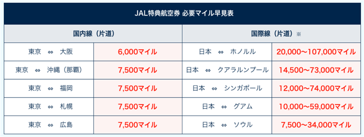 下記は主要な国内、人気の海外への必要マイル数(片道)になります。