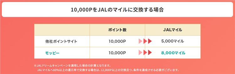 ただし、唯一モッピーだけがJALマイルの交換レートが80%となります!!
