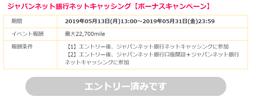 ジャパンネット銀行口座開設とネットキャッシング申込みで22,700mile(11,350円分)!!