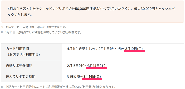 2月11日(火・祝)~20日(木)までの期間中にショッピングリボで合計50,000円(税込)以上ご利用いただくと、最大30,000円キャッシュバックいたします。(追記)2月18日(火)以降に新規発行されたカードによるご利用分は対象外とさせていただきます。