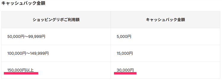 つまり15万円以上のショッピングリボを利用することで3万円のキャッシュバックを受けることができます。