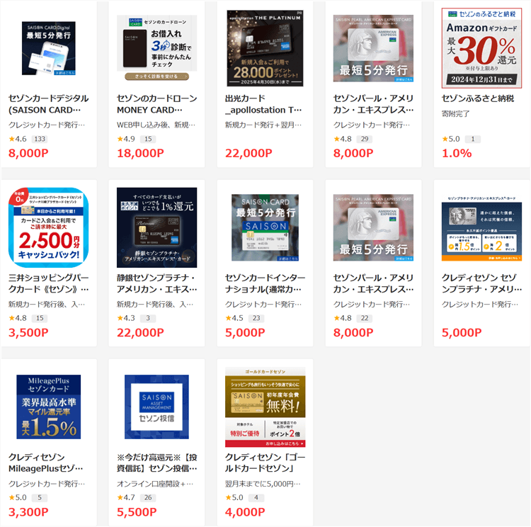 下記は日本最大級のポイントサイト「モッピー」内にあるセゾン系カードの一覧です。