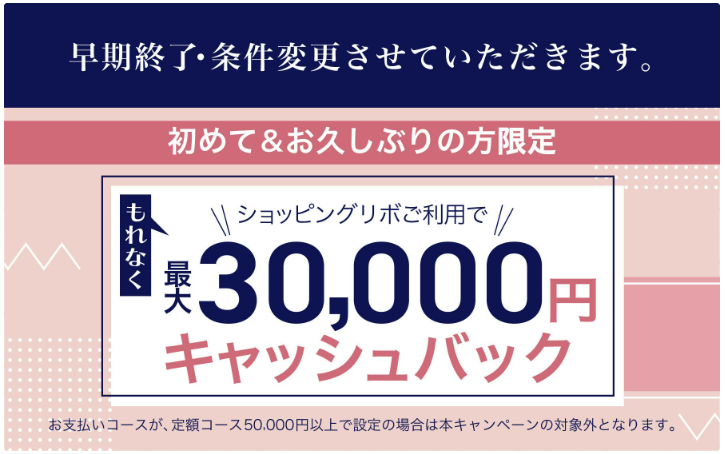 4月お引き落とし分をショッピングリボで合計50,000円(税込)以上ご利用いただくと、最大30,000円キャッシュバックいたします。