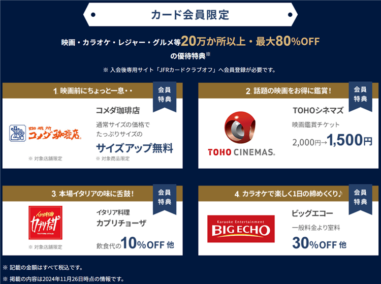 限定ですがTOHOシネマズが500円割引や、カプリチョーザ10%OFFなんかは状況によっては年会費から考えてもお得なんじゃないでしょうかね!?
