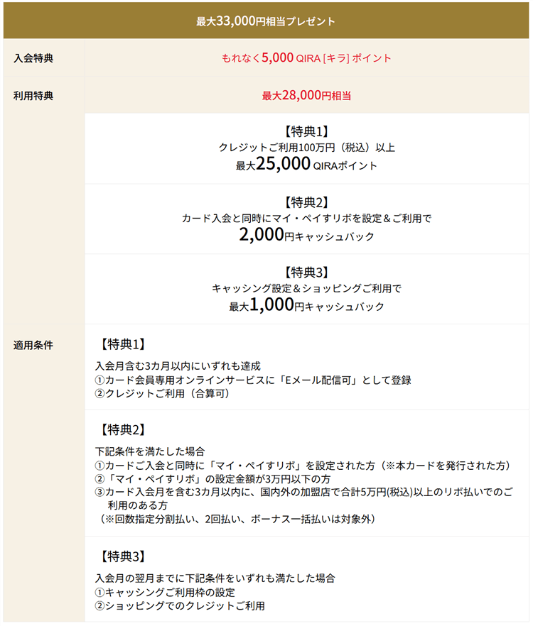 - クレジットご利用100万円(税込)以上25,000 QIRAポイント