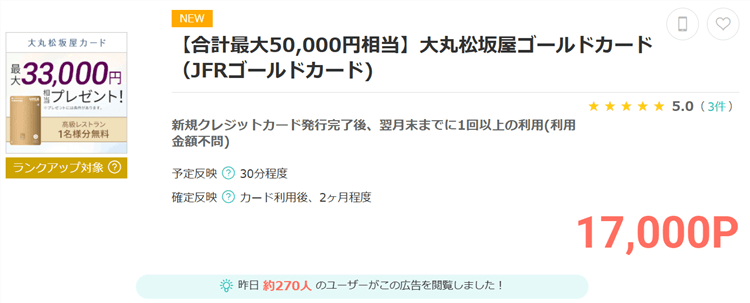 「モッピー」を経由して新規発行して1回の利用だけでなんと17,000円分のポイントが貰えちゃいます!!
