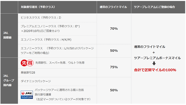 これは何かというと、対象割引運賃でJALグループ便にご搭乗の場合、通常のフライトマイルにツアープレミアムボーナスマイルが加算され、合計で区間マイルの100%マイルが貯まるようになるんです!