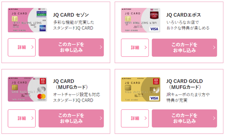 JQ CARDエポス、JQ CARD(MUFGカード)、JQ CARD GOLD(MUFGカード)などSUGOCA一体型のJQ CARDなどもあり、ラインナップは18種類もあります。