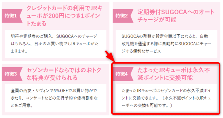 そしてJQカードセゾンを持っていることによってJRキューポのポイントを永久不滅ポイントへ交換が可能となります。