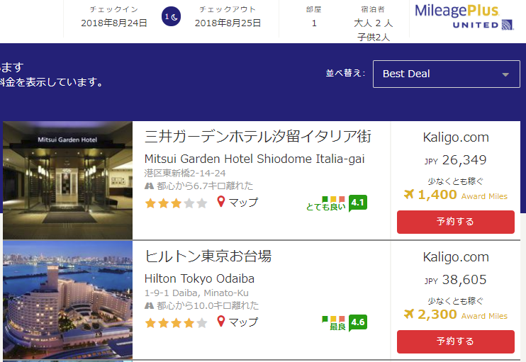 ユナイテッドだと2,300UAマイル!!こちらはいい感じになっています。