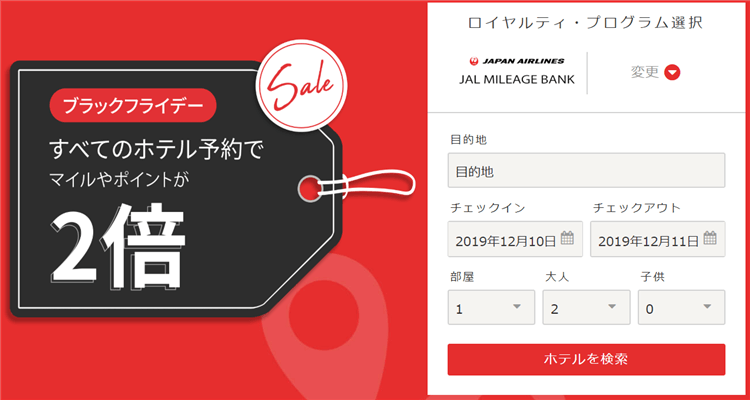 - ホテル予約金額が100,000円以上の場合、ボーナスマイルとして5,000JALマイルプレゼント!