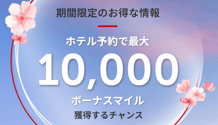 - ホテル予約金額が200,000円以上の場合、ボーナスマイルとして10,000JALマイルプレゼント!