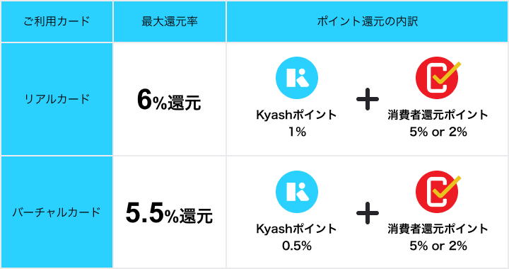 リアルカード:最大6%還元(Kyashポイント1%+消費者還元ポイント5%or2%)