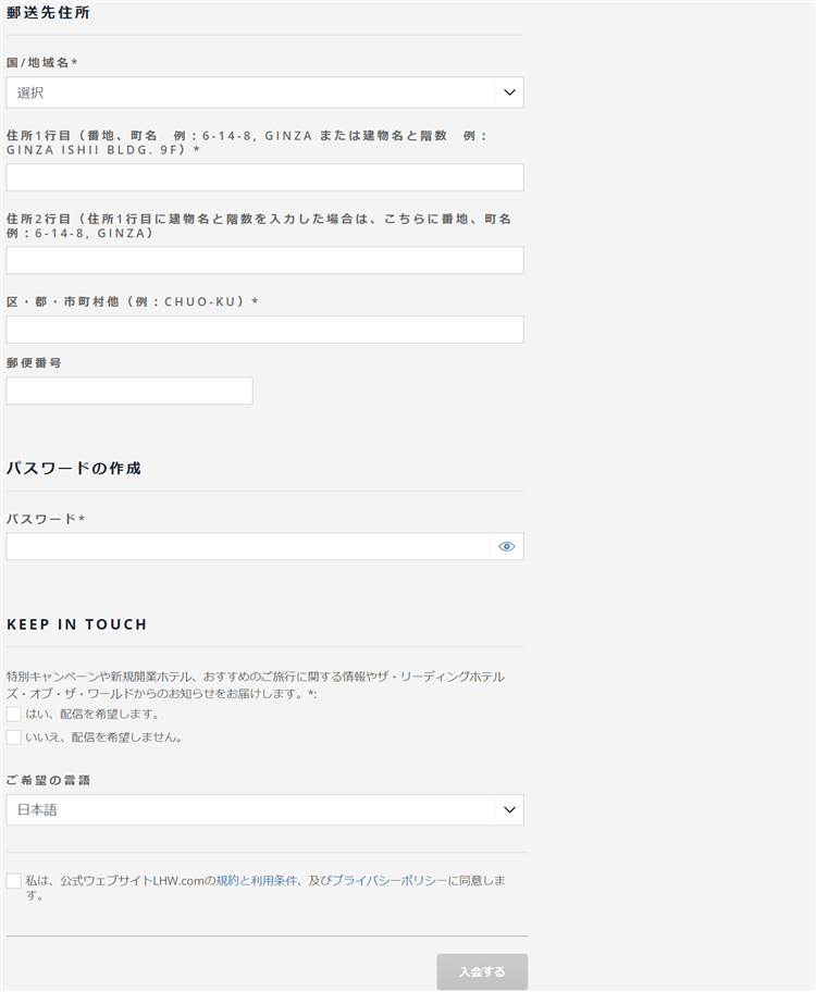 続いて住所、パスワード、言語設定を入力して「入会する」をクリックすれば完了となります!