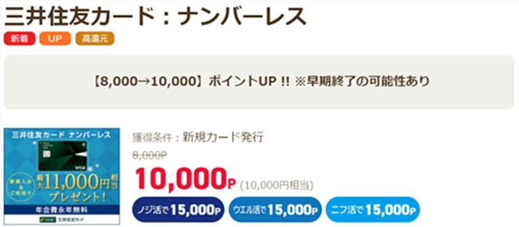 三井住友カードのナンバーレス発行で10,000ポイント!!