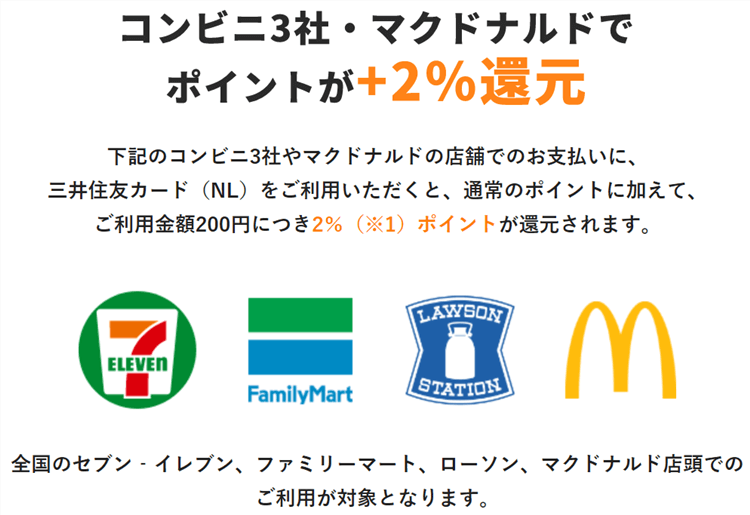 | ポイント | カード利用金額 200円(税込)=1ポイント コンビ二3社とマクドナルド利用時のポイントは+2%還元(※2)。 さらに、セブン-イレブン、ローソン、マクドナルド店頭でVisaのタッチ決済・Mastercard®コンタクトレスを利用すると+2.5%還元(合計5.0%還元) コンビニ・スーパー・ドラッグストア・カフェ・ファストフードなどから選択した3店が常時+0.5%還元(+0.5%=1.0%還元) |
