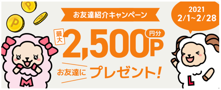 2021/02/01~02/28までに、お友達紹介経由で新規登録した方が対象です。