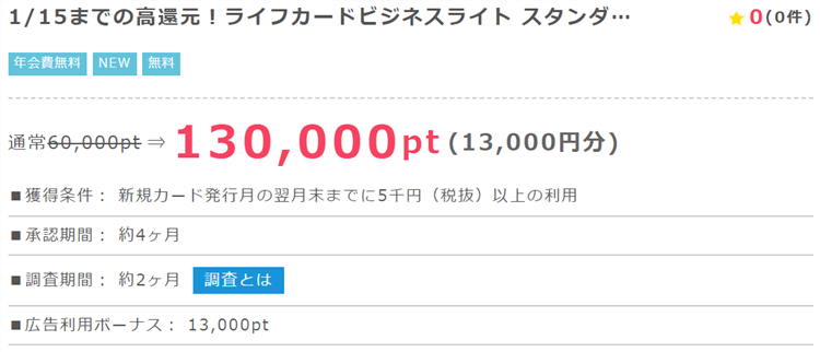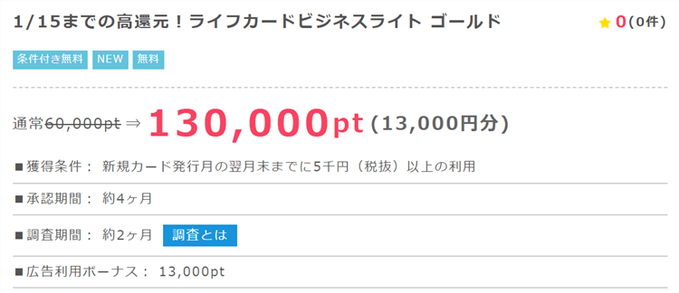 ライフカードビジネスライトゴールドもしくはスタンダードの新規発行と利用で130,000P!おすすめはゴールド!