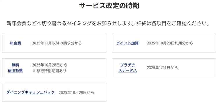 | カード更新時特典 | 年間150万円決済で35,000Pの無料宿泊 →年間250万円決済で50,000Pの無料宿泊 | 年間150万円決済で50,000Pの無料宿泊 →年間400万円決済で75,000Pの無料宿泊 |