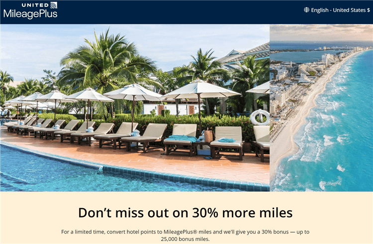 マリオットポイントをユナイテッド航空のマイル(UAマイル)交換で25%増量です。