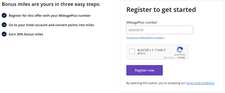 マイレージプラスのホテルポイントからマイルへの移行プログラムにおけるボーナスマイル(以下、「ボーナスマイル」)の獲得には、キャンペーン期間中にポイントからマイルへの移行プログラムを提供するマイレージプラスのホテルパートナープログラムの組み合わせ(以下、「対象となるアクティビティ」)で1回以上のポイントからマイルへの交換で特典マイルを獲得する必要があります。対象となるアクティビティは、2023年10月31日米国東部標準時午後11時59分までに完了する必要があります。