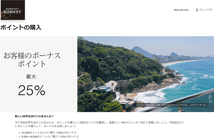 - 2025年7月16日まで!マリオットポイントセールキャンペーン40~50%ボーナス!【終了】