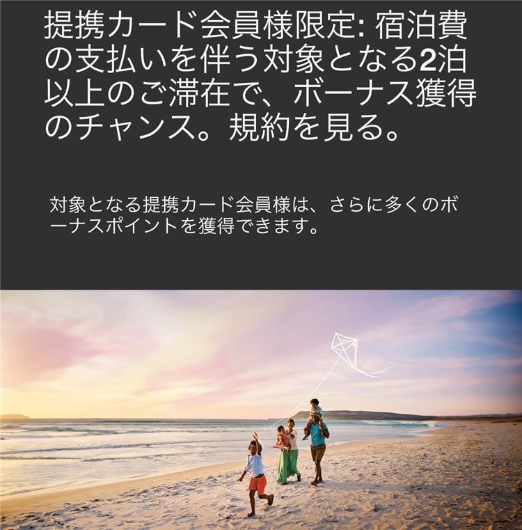 Marriott Bonvoy®アカウントのご登録が必要です。2025年10月14日から2025年12月27日の期間中に本プロモーションにご登録いただいたMarriott Bonvoy会員のお客様は、Marriott Bonvoy参加プロパティ/デスティネーションでの、登録後の宿泊費の支払いを伴う、対象となるご滞在ごとに2,025Marriott Bonvoyボーナスポイントを獲得できます。獲得対象となるのは、74日間のプロモーション獲得期間中、最大3回までです。本プロモーションの対象外となるMarriott Bonvoyの特定ブランドについては、以下をご覧ください。2025年10月14日から2025年12月27日までに本プロモーションにご登録いただいたMarriott Bonvoy会員のお客様は、74日間のプロモーション獲得期間中、Marriott Bonvoy Outdoorsでの、登録後の宿泊費の支払いを伴う、対象となるご滞在ごとに2,000Marriott Bonvoyボーナスポイントを追加で獲得できます。本プロモーションに登録するには、www.marriottbonvoy.com/ja/celebrate2025ページをご確認いただくか、Marriott Bonvoyアカウントにログインして、[プロモーション] タブをご覧ください。本プロモーションは、2025年10月28日から2026年1月10日の間に完了した宿泊費の支払いを伴うご滞在が対象となり、ポイント獲得対象料金 (「対象レート」) で予約されたご滞在にのみ適用されます。Marriott Bonvoy参加プロパティでのアワード交換によるご滞在は対象外です。会員のお客様は、本プロモーションの獲得期間中、宿泊費の支払いを伴う、対象となるご滞在最大3回まで、2,025ボーナスポイントを獲得できます。本プロモーションのボーナスポイント獲得の対象となるのは、プロモーション登録完了後、プロモーション獲得期間中に完了した宿泊費の支払いを伴う、対象となるご滞在に限ります。本プロモーションの規約により、ご滞在がプロモーションの対象となるには、ご滞在の時点で当該プロパティがMarriott Bonvoyに参加していることが必要であることにご留意ください。「滞在」とは、対象レートでの宿泊で、チェックイン/チェックアウトの回数にかかわらず、同一のプロパティでの連続した宿泊を指します。キャッシュ+ポイント、無料宿泊特典、ポイント交換を含む、アワード交換による滞在は、本プロモーションの対象外です。大多数の第三者オンライン販売業者および一部の旅行代理店によって提供される宿泊料金 (「非対象レート」) は、本プロモーションの対象外です。ブルガリ、ザ・リッツ・カールトン ヨットコレクション、マリオット・エグゼクティブ・アパートメントでのご滞在、およびマリオット・バケーション・クラブ、グランド・レジデンス・バイ・マリオット、マリオット・グランド・レジデンス・クラブ、シェラトン バケーションクラブ、ウェスティン バケーションクラブ、ザ・リッツ・カールトン・クラブ、セントレジス レジデンスクラブ、ラグジュアリーコレクション レジデンスクラブでのオーナーの方によるご滞在の週は、本プロモーションの対象外です。宿泊費の支払いを伴う対象となる各滞在で、1プロパティにつき1室のみが、本プロモーションによる会員の宿泊費の支払いを伴う対象となる滞在として計上されます。通常、ご滞在はチェックアウト後10営業日以内に会員のアカウントに反映されます。Marriott Bonvoy参加プロパティでの宿泊費の支払いを伴う、対象となるご滞在ごとに付与される2,025ボーナスポイントは、完了した滞在がアカウントに反映された後、通常5営業日以内に会員のアカウントに付与されます。対象となるホーム&ヴィラ・バイ・マリオット ボンヴォイでのご滞在では、ご滞在ごとに2,025ボーナスポイントに加えて2,000ボーナスポイントが加算され、ご滞在ごとに合計4,025ポイントを獲得できます。ホーム&ヴィラ・バイ・マリオット ボンヴォイでの宿泊費の支払いを伴うご滞在に対するボーナスポイントは、本プロモーションの獲得期間終了後、6週間以内に付与されます。Marriott Bonvoy Outdoorsデスティネーションでの宿泊費の支払いを伴う、対象となるご滞在ごとに付与される追加の2,000ボーナスポイントも、プロモーション獲得期間終了後6週間以内に会員アカウントに付与されます。マイルの獲得を選択している会員の方は、このプロモーションの対象外となります。マリオット・インターナショナルおよびその子会社の従業員、ならびにマリオットがフランチャイズ契約、所有、賃貸、または管理する場所に勤務するその他すべてのアソシエートは、本プロモーションに参加し、宿泊費の支払いを伴う対象となる滞在に対し、ボーナスポイントを獲得する資格を有します。マリオットは、取引に関連して不正行為があったと疑われる場合、独自の裁量により、本プロモーションに関連する取引を防止、取消、調整、またはその他の方法で履行を拒否する権利を留保します。現在Marriott Bonvoyに参加しているプロパティの一覧については、Marriott Bonvoyをご覧ください。Marriott Bonvoy利用規約のすべての規定が適用されます。詳細につ
