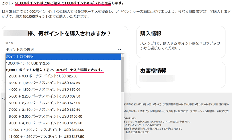 *2,000ポイント以上のポイント購入で40%のボーナスポイントを獲得するには、日本時間の2023年2月16日23時から2023年4月4日12時59分 (米国東部時間2022年2月16日9時から2022年4月3日23時59分) までにご購入を完了していただく必要があります。